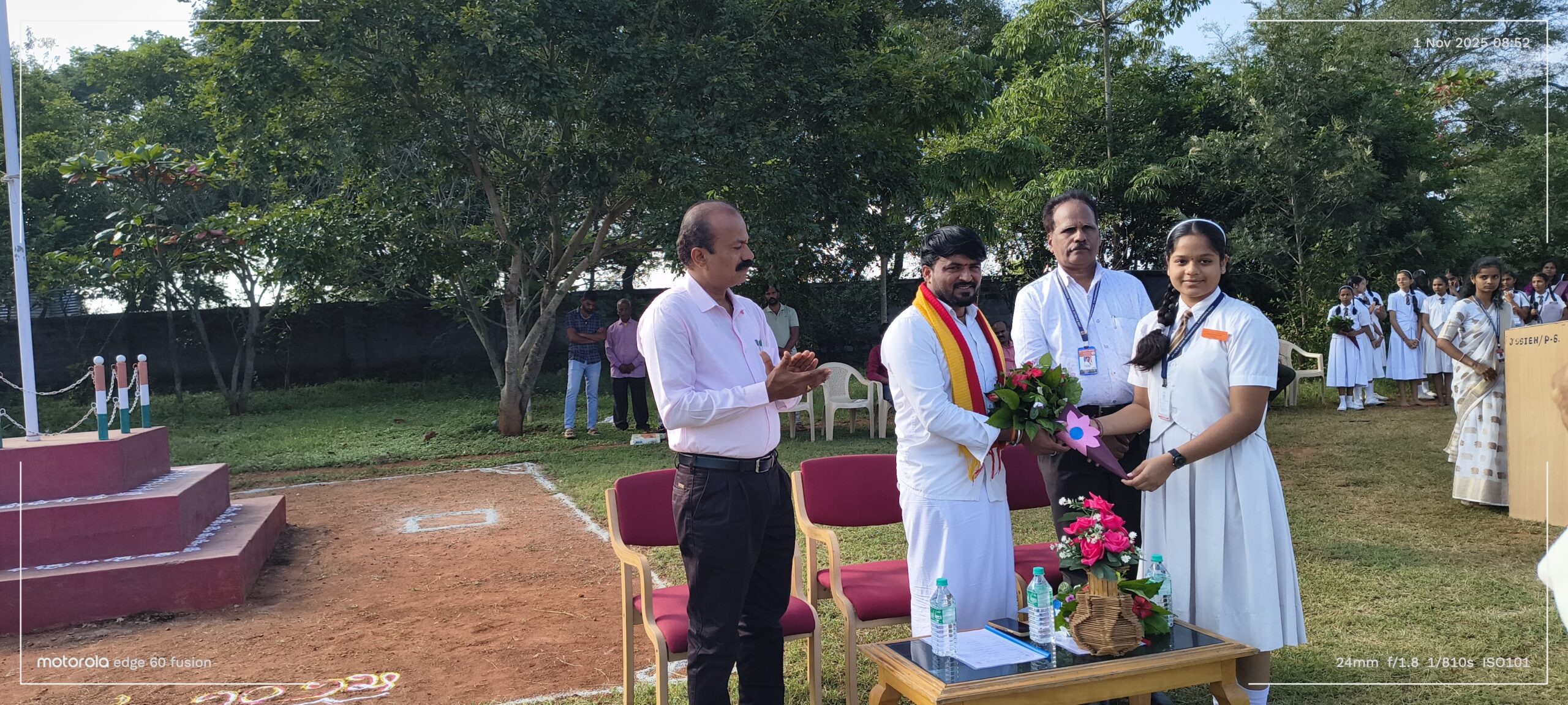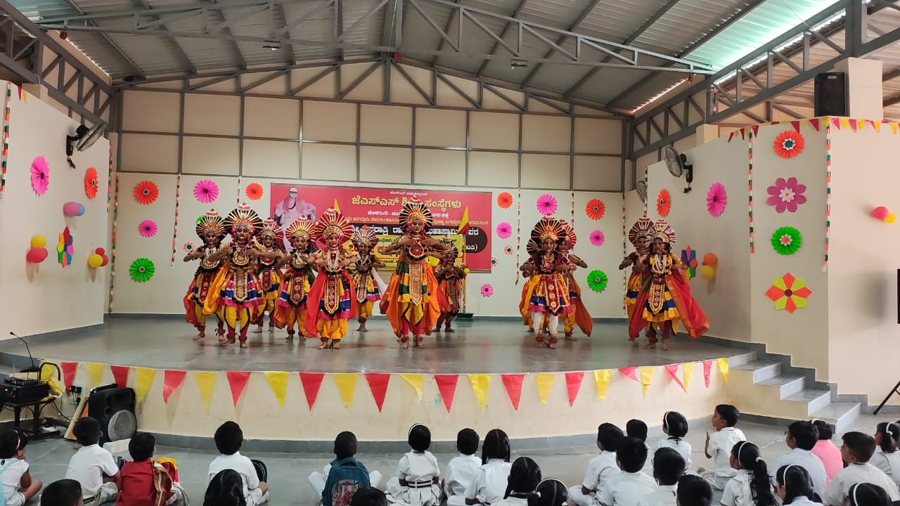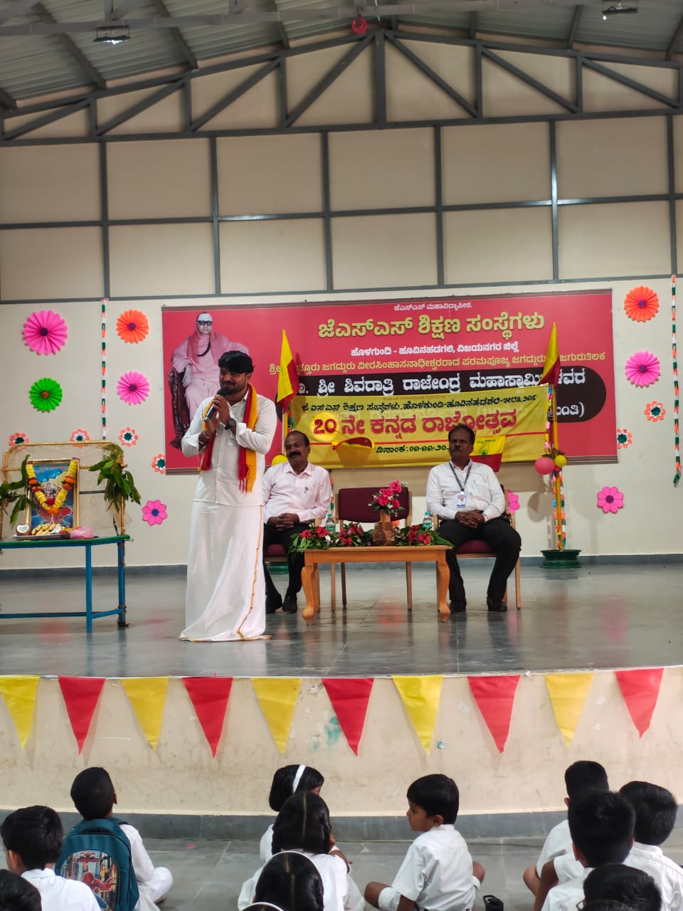 The celebration began with the invocation song sung by the school choir, invoking the blessings of Goddess Bhuvaneshwari. The hoisting of the tricolor flag was done by the Chief Guest, Shri Ramesh M Lamani, singer and runner-up of Saregamapa Kannada Season-20, along with Mr. N. Guruswamy, Principal, JSS Public School, Huvinahadagali, and Dr. H. P. Ramesh, Principal, JSS B.Ed College, Huvinahadagali. Teaching and non-teaching staff, also with students, gathered on the bright and pleasant morning of 1st of November 2025 to witness the event.
