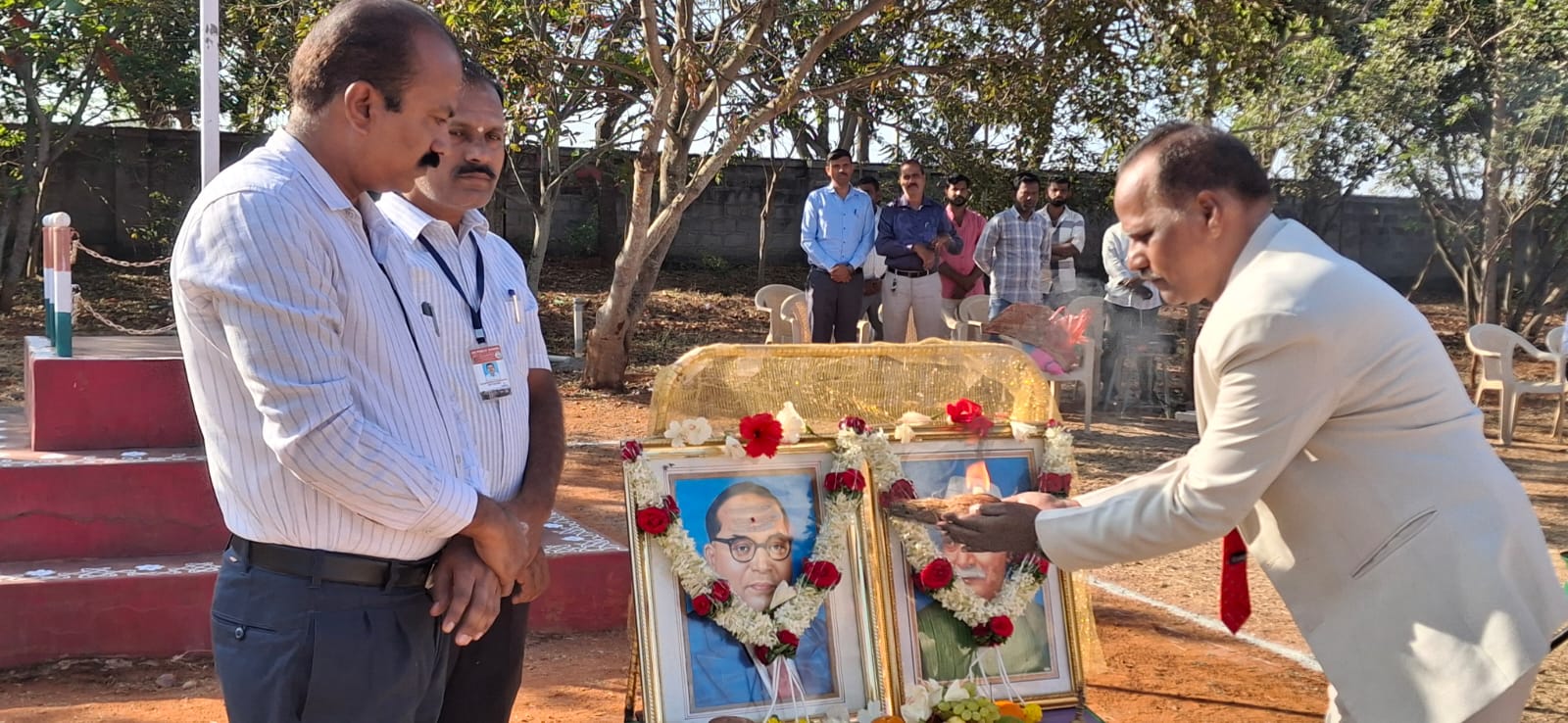 Paying homage to the portrait of Gandhiji's and Shastriji's by the school principal, Mr N Guruswamy, Staff and Students.